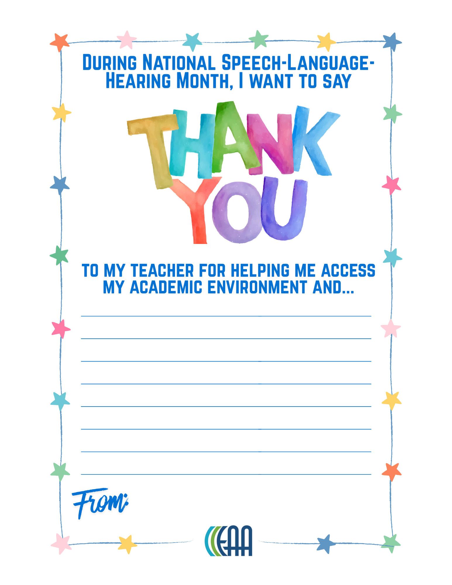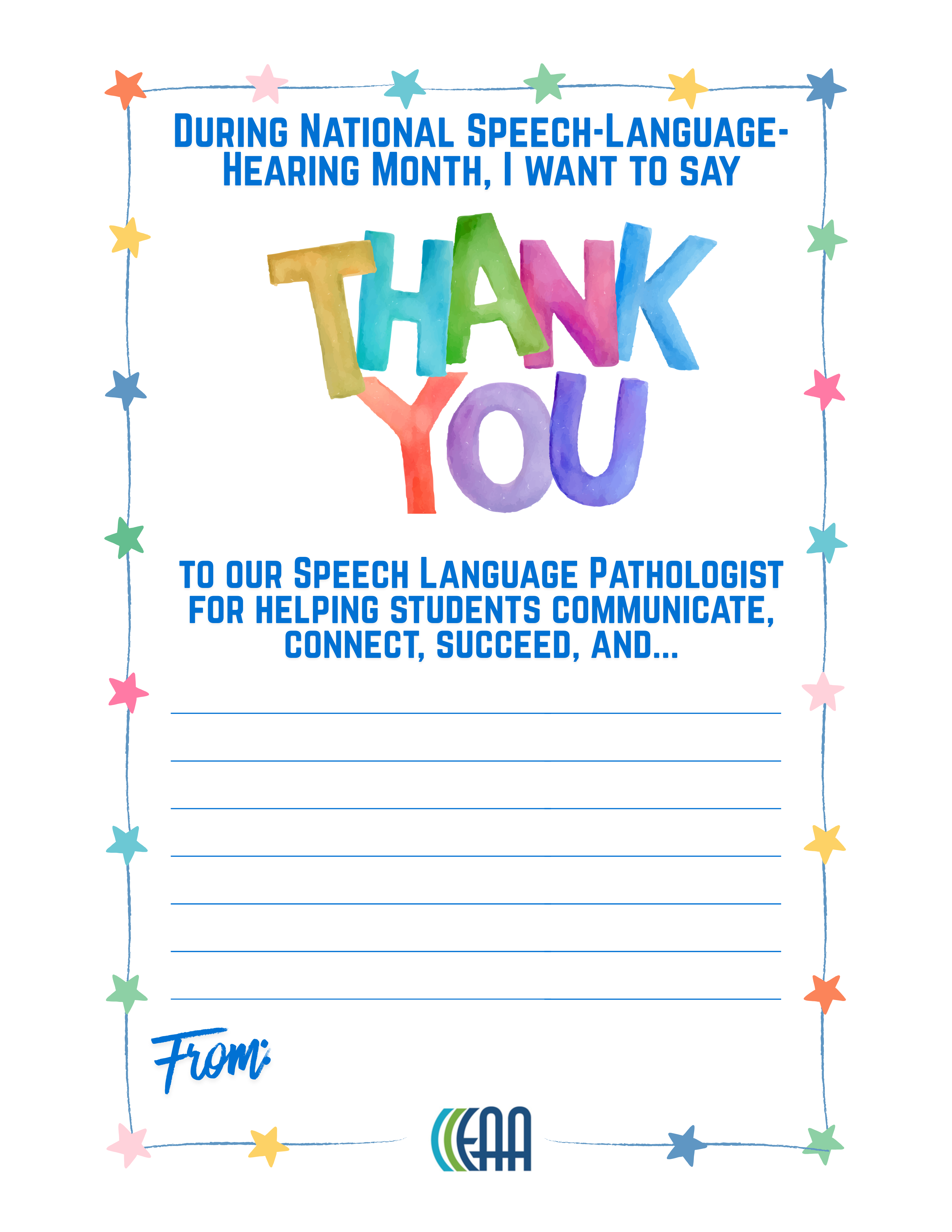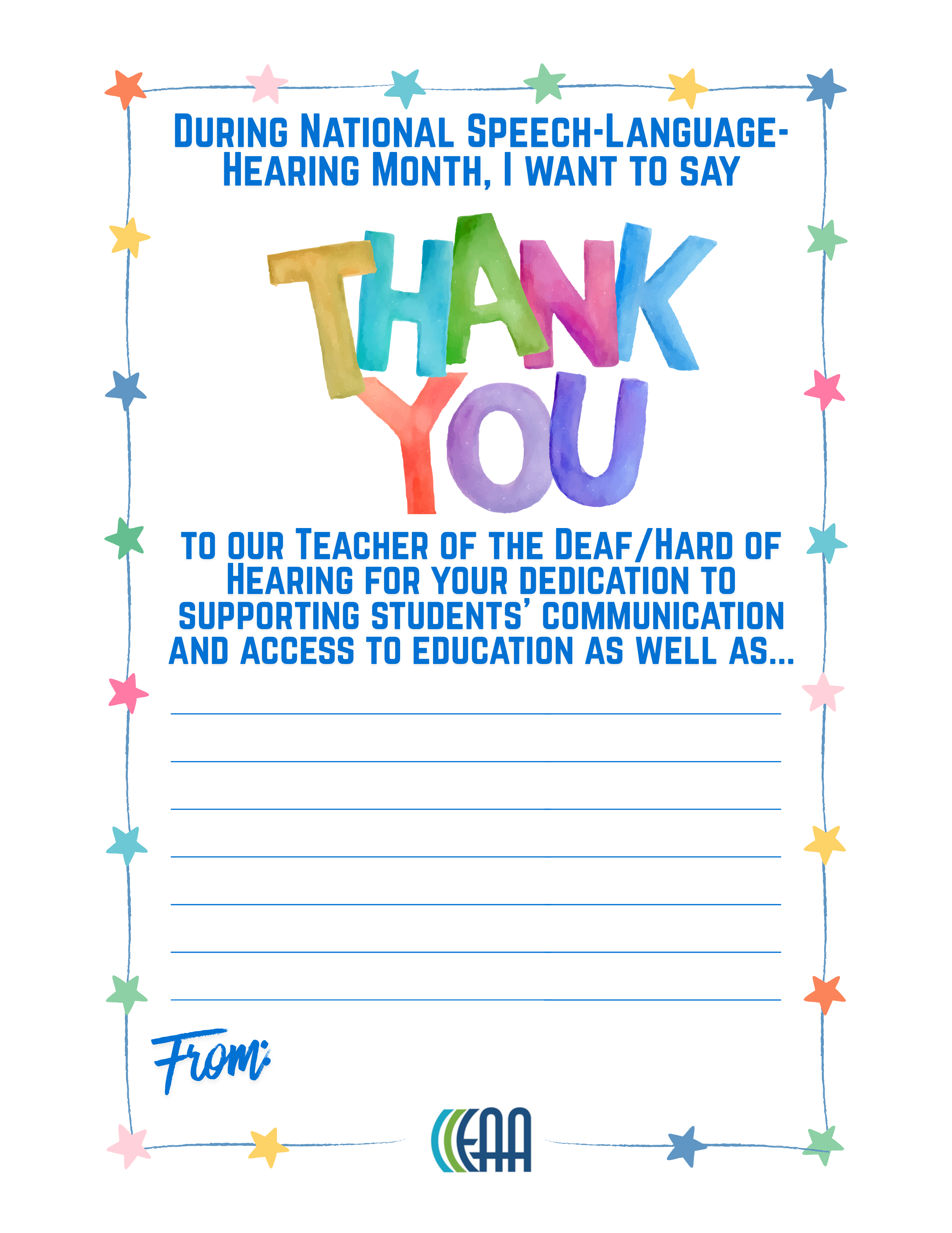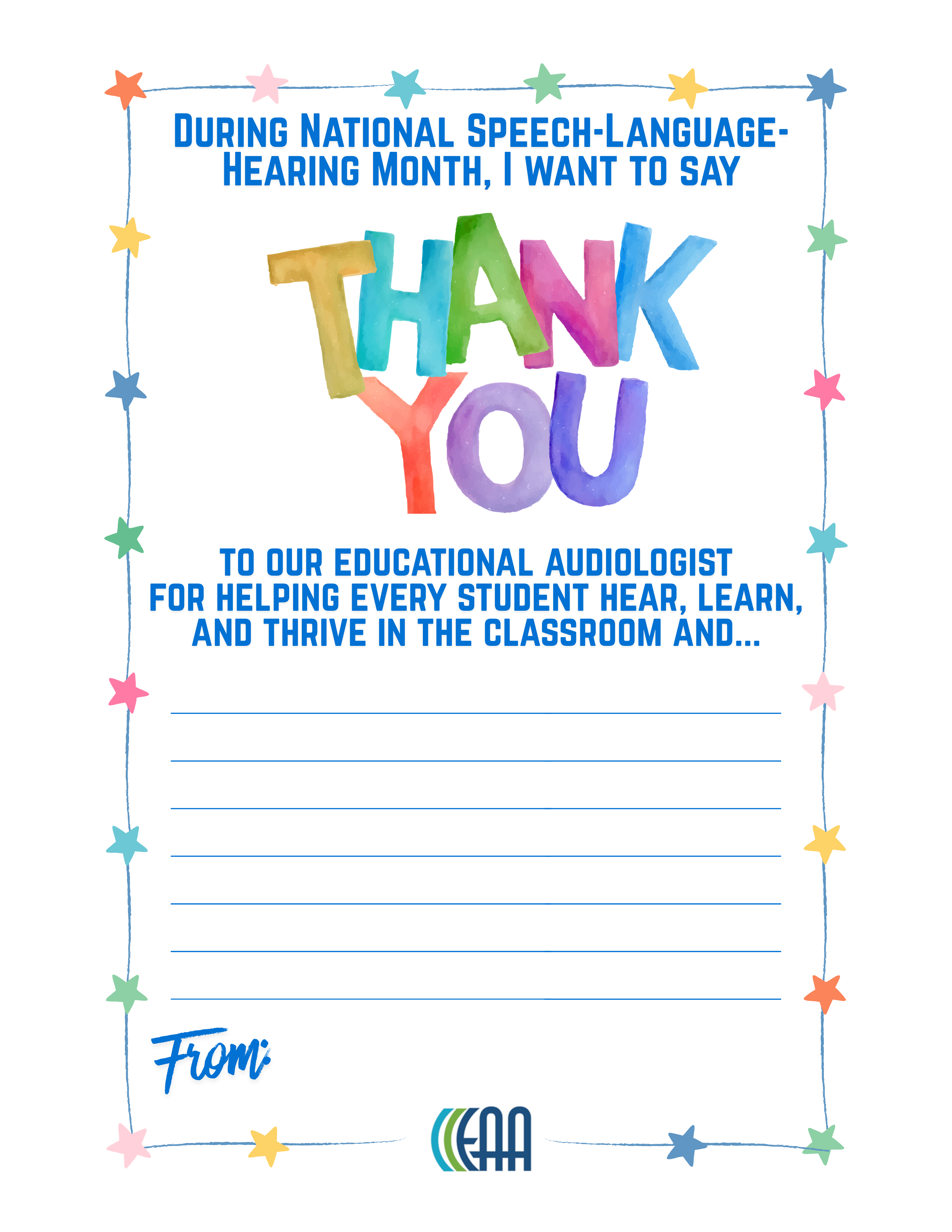 Every May National Speech-Language-Hearing MonthRaising awareness about communication disorders and the vital role of special service providers — including educational audiologists — in providing life-changing services. #NSLHM #EdAudAdvocacy #edauds #eaa What Is NSLHM?Each May, National Speech-Language-Hearing Month (formerly Better Hearing and Speech Month) provides an opportunity to educate the public about communication disorders and celebrate the professionals who help people communicate. Educational audiologists play a critical role in ensuring that children with hearing loss and auditory processing challenges can access the curriculum and participate fully in school. NSLHM is a perfect time to raise awareness of what educational audiologists do — and why every school district needs one. Why It Matters for Educational AudiologyMore than 5.1 million children and teens ages 6–19 in the United States have some degree of hearing loss (ASHA). Early identification and intervention in the school setting make a measurable difference in academic outcomes. Educational audiologists are uniquely positioned to bridge clinical hearing care and classroom access — from hearing screening programs and hearing assistive technology management to 504/IEP team participation and teacher in-service training. How to Get InvolvedSpread the Word Use #EdAudAdvocacy, #NSLHM, #edauds, #eaa on social media. Share posts from EAA to amplify the message. Tag @EduAud so the community can see your efforts! Educate Your Schools Share EAA's infographics and resource library materials with teachers, administrators, and parents during May. Use resources from Noisy Planet and Dangerous Decibels to teach students about safe listening. Offer a brief in-service on hearing loss in the classroom or how hearing assistive technology supports learning. Classroom Activities Use EAA's printable activities to teach students about hearing, listening, and the technology that helps their peers learn. AAA also offers resources just for kids and young adults. Hearing Technology Scavenger Hunt — Students explore their school to find various types of amplification, remote microphones, HAT systems, and more (PDF) Thank You Door Posters — Printable posters for students and staff to write thank-you messages. Available for: Educational Audiologist | School Nurse | SLP | Teacher of the DHH | Teacher My Hearing Technology Worksheet — Students identify their devices, draw and label them, and write about what helps them hear best in class (PDF) Who Helps Me Hear at School? — A matching activity where students connect school professionals to what they do to support hearing (PDF) Celebrate and Connect Join the EAA Community to connect with fellow educational audiologists, share NSLHM activities, and swap ideas for school-based awareness events. Recognize colleagues, SLPs, and teachers who support students with hearing and communication needs. Connect families with organizations like Hands & Voices and the National Deaf Center. Also in May Teacher Appreciation WeekMay 4–8, 2026 | National Teacher Day: May 5 Teachers of the deaf and hard of hearing, general education teachers, and itinerant staff are essential partners in supporting students with hearing loss. Teacher Appreciation Week is the perfect time for educational audiologists to recognize the educators who go the extra mile — checking hearing aids each morning, wearing a remote microphone, adjusting seating, previewing vocabulary, and advocating for their students every day. #ThankATeacher #NSLHM #EdAudAdvocacy Ways Educational Audiologists Can Thank the Teachers They Work WithDrop Off a Treat — Bring coffee, a small gift card, or a snack basket to the teachers you collaborate with. Attach a note like, "Thanks for being a great partner in helping our students hear and learn!" Send an Email to Their Principal — Let school administrators know how a particular teacher has gone above and beyond for students with hearing loss. Public recognition from another professional carries real weight. Share a Resource — Give teachers something useful — an EAA infographic about classroom acoustics, a quick-reference card for hearing technology troubleshooting, or a link to a helpful webinar. More May ObservancesMay is packed with opportunities to recognize the school-based professionals educational audiologists work alongside every day. May 1 — School Principals' Day | Principals are key partners in securing educational audiology services and supporting students who are deaf and hard of hearing. May 4–8 — Teacher Appreciation Week | See above for ways to thank the teachers you work with! May 6 — National School Nurse Day | School nurses are often the first to notice hearing concerns and are valuable partners in hearing screening programs. May 18 — National Speech-Language Pathologist Day | SLPs and educational audiologists collaborate closely to support students with hearing and communication needs. Social Media ToolkitCopy, customize, and share these sample posts throughout May. May is National Speech-Language-Hearing Month! Did you know educational audiologists ensure that students with hearing loss have equal access to learning? Learn more at edaud.org. #NSLHM #EdAudAdvocacy #audpeeps More than 5 million children and teens ages 6–19 have some degree of hearing loss (ASHA). Early identification by school-based audiologists makes all the difference. Learn how at edaud.org. #NSLHM #EdAudAdvocacy Every child deserves to hear their teacher clearly. Educational audiologists manage hearing assistive technology, conduct screenings, and collaborate with IEP teams to make that happen. #NSLHM #audpeeps #EdAudAdvocacy Happy Teacher Appreciation Week! A special thank you to the teachers who wear remote microphones, check hearing aids, and go the extra mile every day for students who are deaf and hard of hearing. You are essential partners in access. #ThankATeacher #NSLHM #EdAudA